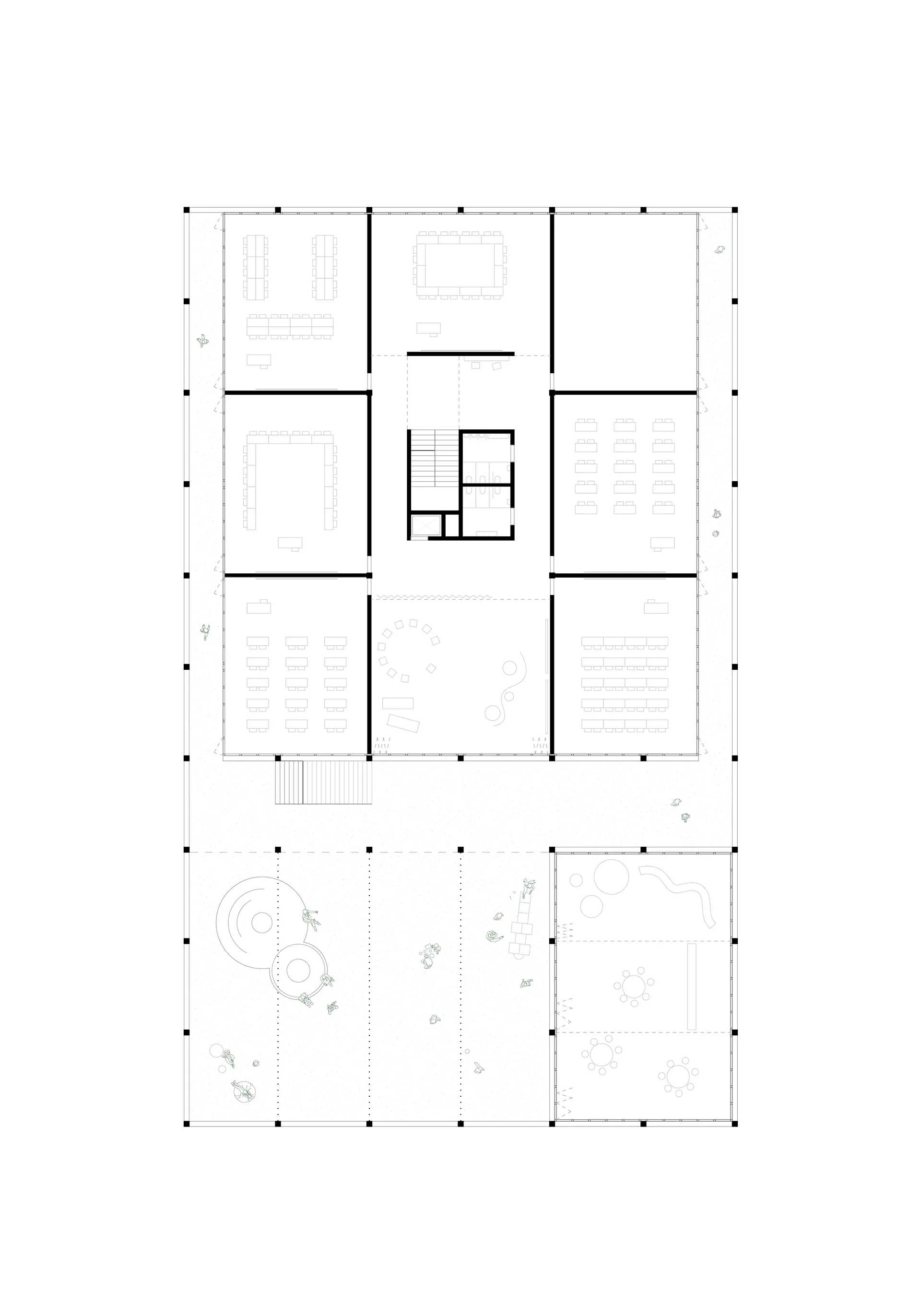The classrooms are arranged around a central distribution core, which rationalizes the interior space and reduces the building's footprint. The building's structure is simple and rational. Formed by a regular 5x5m grid, composed of wooden pillars supporting beams and joists. This structure is anchored on a recycled concrete base, used exclusively for the buried parts of the building. The floors are composed of prefabricated mixed wood and low-carbon concrete slabs of the Hoffmann type, allowing for significant spans while providing optimal thermal and acoustic comfort.